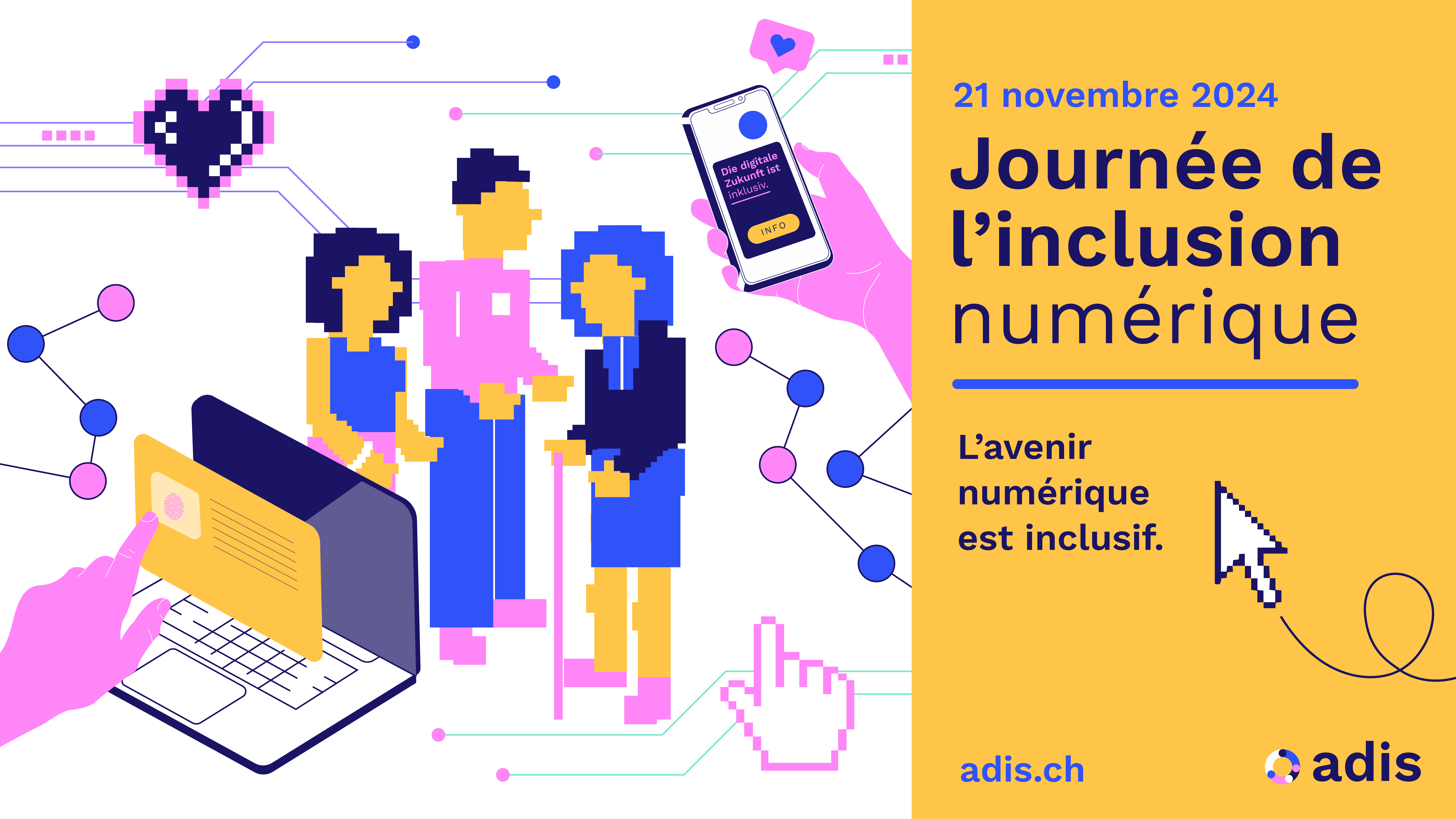 Pour rendre visible le danger de l’exclusion numérique, qui ne cesse de croître, l’Alliance Inclusion numérique suisse (ADIS) lance la Journée de l’inclusion numérique. Cette journée aura lieu chaque année le 21 novembre. Ayant pour vision une société numérique à laquelle tout le monde puisse participer, elle sensibilisera l’opinion publique à la fracture numérique qui menace particulièrement les personnes ayant peu de compétences numériques, les personnes handicapées et les personnes âgées. Elle attirera l’attention sur l’importance de supprimer les obstacles et de créer une égalité des chances pour tous les utilisateurs du monde numérique.